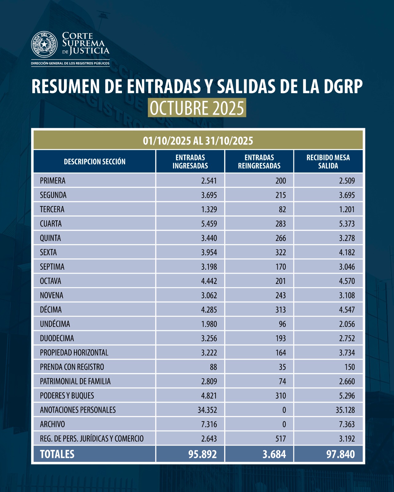 Estadísticas 2025 de la D.G.R.P. Resumen de Entradas y Salidas clic en la imagen para ampliar Octubre 2025 Septiembre 2025 Agosto 2025 Julio 2025 Junio 2025 Mayo 2025 Abril 2025 Marzo 2025 Febrero 2025 Enero 2025 Twittear