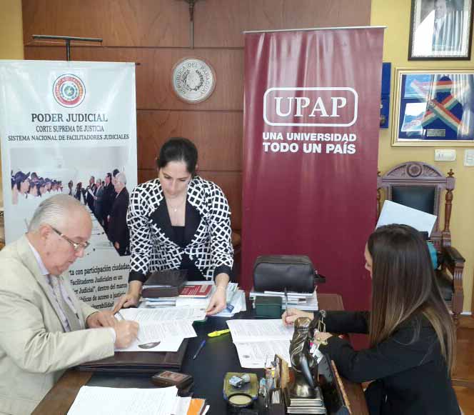 En el despacho del ministro doctor Miguel Óscar Bajac se llevó a cabo la firma del acuerdo de memorándum de entendimiento entre la Facultad de Ciencias Jurídicas de la Universidad Politécnica y Artística (UPAP) y el Sistema Nacional de Facilitadores Judiciales. Participaron del acto en representación el ministro responsable, doctor Miguel Óscar Bajac, y la doctora María Eugenia Crichigno Paoli, en representación de la universidad en carácter de decana.