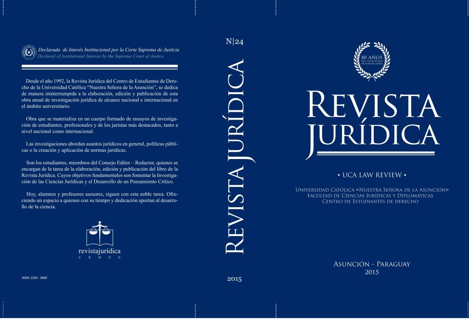 El Consejo Editor de la Revista Jurídica del Centro de Estudiantes de Derecho de la Facultad de Ciencias Jurídicas y Diplomáticas de la Universidad Católica “Nuestra Señora de la Asunción” (Ceduc) presenta la vigesimocuarta edición de la Revista Jurídica, declarada de interés institucional por la Corte Suprema de Justicia por Resolución N° 5956, del 25 de agosto de 2015.