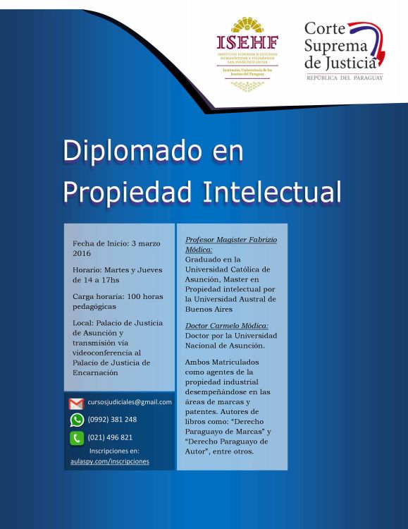 El próximo 3 de marzo, en el Palacio de Justicia de Asunción, de 14:00 a 17:00, se iniciará el curso Diplomado en Propiedad Intelectual. Las jornadas se desarrollarán los días martes y jueves y serán transmitidas vía videoconferencia a la sede judicial de Encarnación.