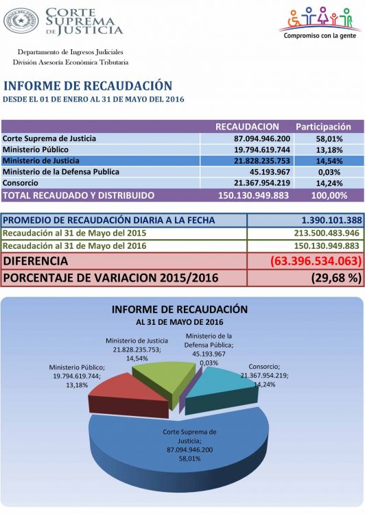 Según el informe proveído por el Departamento de Ingresos Judiciales, dependiente de la Corte Suprema de Justicia, desde enero a mayo del corriente año se registró una recaudación de G. 150.130.949.883 en concepto de tasas judiciales.