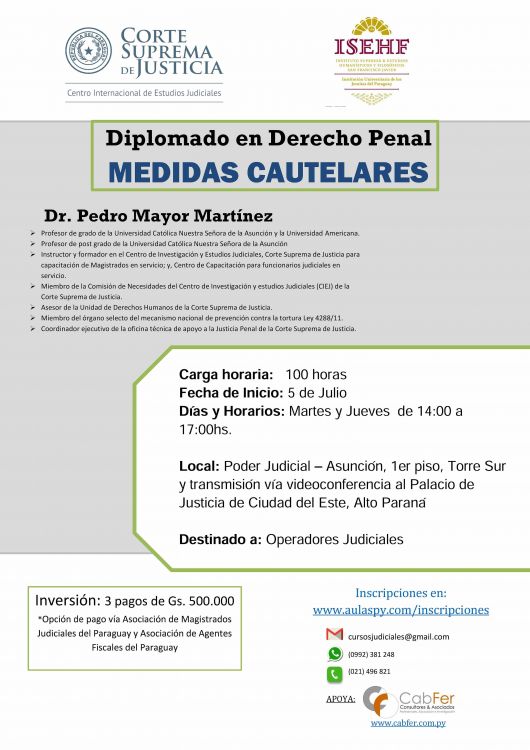 El martes 5 de julio del corriente, en la sede del Poder Judicial de Asunción, está previsto el inicio del Curso “Diplomado en Derecho Penal, Medidas Cautelares”, organizado por la Corte Suprema de Justicia, conjuntamente con el Instituto Superior de Estudios Humanísticos y Filosóficos (ISEHF), que se realizará todos los martes y jueves de 14:00 a 17:00.