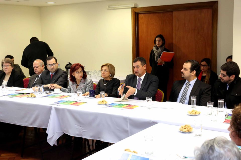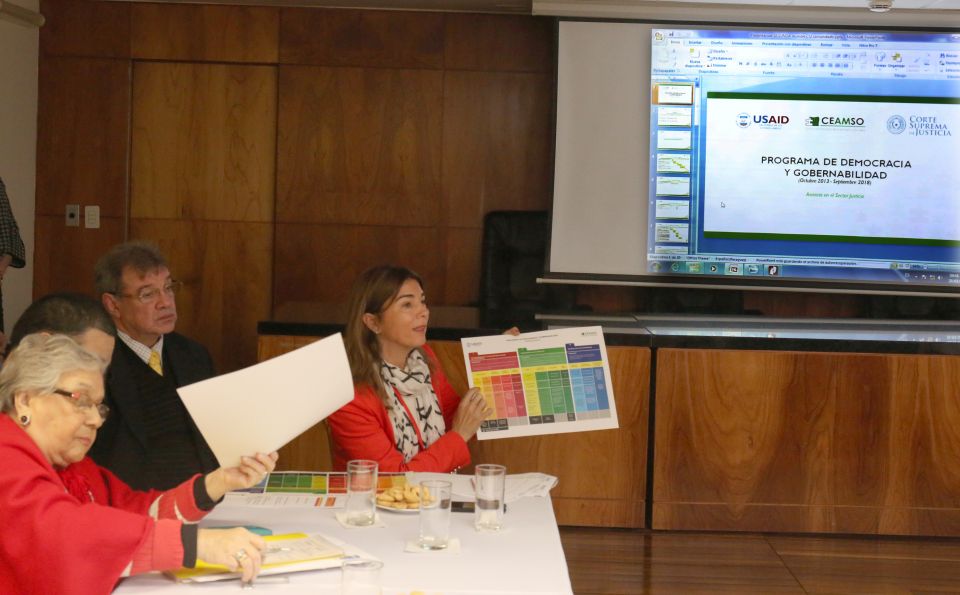 Con la presencia de la presidenta de la Corte Suprema de Justicia, doctora Alicia Pucheta; la vicepresidenta segunda, doctora Miryam Peña, y el ministro Luis María Benítez Riera se llevó a cabo la presentación de los avances en el Programa de Democracia y Gobernabilidad, con los representantes de Usaid y el Centro de Estudios Ambientales y Sociales (Ceamso), además de los directores involucrados de las distintas dependencias del Poder Judicial. La reunión se realizó en el Salón de Conferencias del octavo piso de la torre norte del Palacio de Justicia de Asunción.