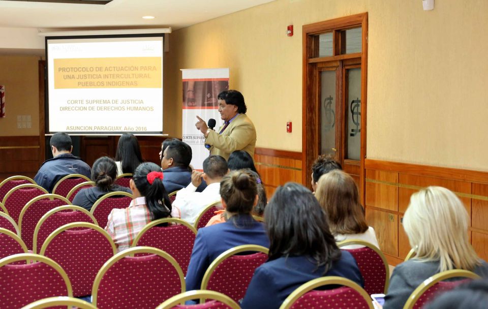 Se realizó esta mañana en la sede judicial de Asunción la jornada de socialización del Protocolo de Actuación para una Justicia Intercultural para jueces de Paz. La actividad, organizada por la Dirección de Derechos Humanos de la máxima instancia judicial, contó con la participación de la presidenta de la Corte Suprema de Justicia, doctora Alicia Pucheta de Correa, además de magistrados, representantes de diversas organizaciones, líderes de comunidades indígenas e invitados especiales.