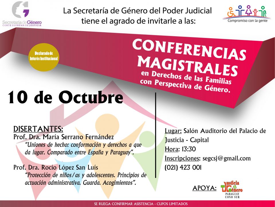 El próximo 10 de octubre en el Palacio de Justicia de Asunción se llevarán a cabo las Conferencias Magistrales sobre "Derechos de las Familias con Perspectiva de Género". La actividad es organizada por la Secretaría de Género del Poder Judicial y fue declarada de interés institucional por la Corte Suprema de Justicia.