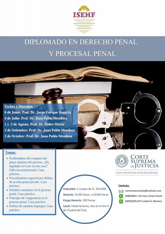 El 6 de junio, en el Hotel Amares de Ciudad del Este, se iniciará el Diplomado en Derecho Penal y Procesal Penal. La actividad se extenderá hasta el mes de octubre y cuenta con el apoyo del Centro Internacional de Estudios Judiciales (CIEJ).