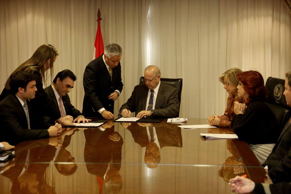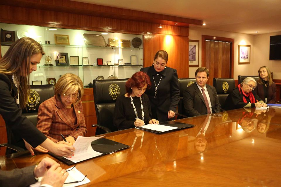 La Corte Suprema de Justicia suscribió esta mañana un convenio de adhesión al servicio denominado “Oficio Electrónico” con el Banco Nacional de Fomento. El acuerdo fue firmado por el titular de la máxima instancia judicial, doctor Luis María Benítez Riera y el presidente de la citada entidad bancaria, licenciado Carlos Alberto Pereira. Además participaron las ministras Alicia Pucheta y Miryam Peña.