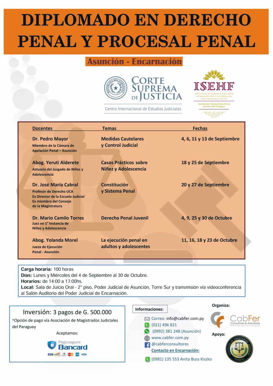 El Centro Internacional de Estudios Judiciales (CIEJ) y el Instituto Superior de Estudios Humanísticos y Filosóficos (ISEHF) invitan a participar del Diplomado en Derecho Penal y Procesal Penal, que tendrá lugar en la sede del Palacio de Justicia de Asunción y transmisión vía videoconferencia al Salón Auditorio de la sede judicial de Encarnación. Cabe destacar la organización de Consultores y Asociados (CabFer) y el apoyo de la Asociación de Magistrados Judiciales del Paraguay.