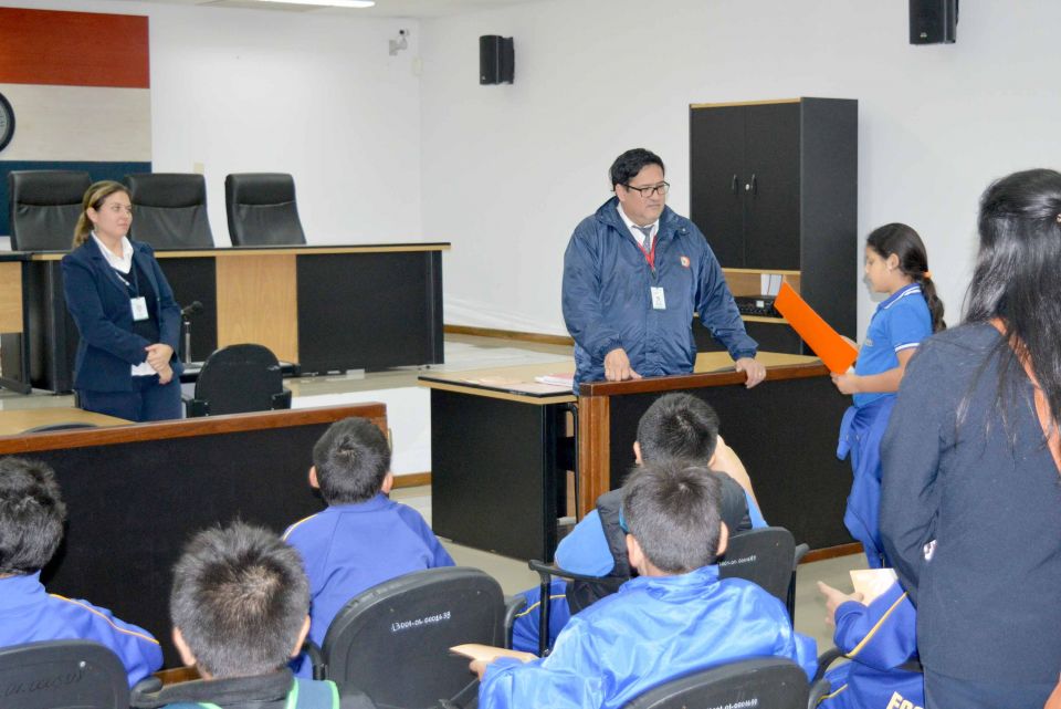 En la sala de juicios orales los estudiantes fueron interiorizados sobre el funcionamiento del Poder Judicial, su fecha de creación y los distintos juzgados así como dependencias con que cuenta.