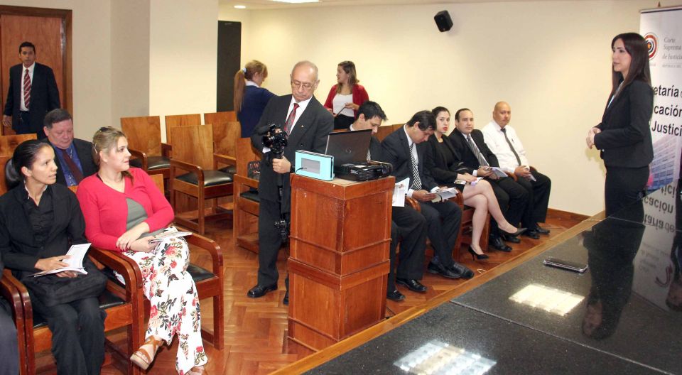 El circuito se inició con la visita a la sala de juicios de orales, ubicada en el sexto piso de la torre sur del Palacio de Justicia de Asunción.