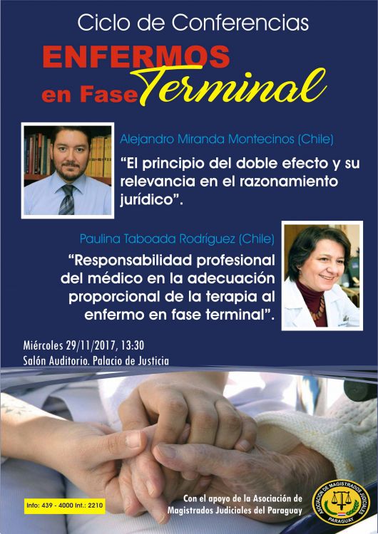 El ciclo de conferencias impulsado por el Instituto de Investigaciones Jurídicas (IIJ), dependiente de la Corte Suprema de Justicia, denominado "La Protección de la Persona Humana - Enfermos en fase Terminal" tiene prevista su clausura el próximo miércoles 29 de noviembre. Se llevará a cabo en el Salón Auditorio del Palacio de Justicia de Asunción, a partir de las 13:30.