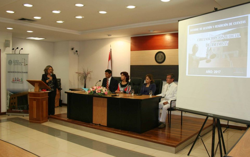 En presencia de la ministra de la Corte Suprema de Justicia doctora Miryam Peña, fue presentado días pasados el Informe de Gestión y Rendición de Cuentas de la Ejecución Presupuestaria del año 2017 correspondiente a la Circunscripción Judicial de Amambay. Esta actividad contó con la coordinación del presidente del Consejo de Administración de dicha jurisdicción, Luis Alberto Benítez Noguera.
