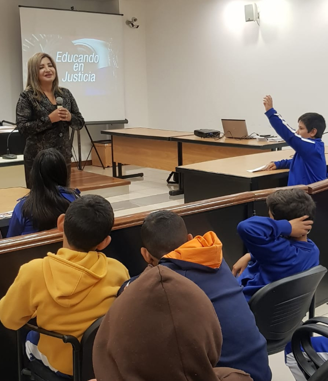 Finalmente los alumnos del sexto grado pudieron dialogar con un juez de la Niñez doctor Elvio Insfrán en una sala de audiencias. Los visitantes escucharon al magistrado sobre cómo se resuelven los conflictos que se suscitan en ese recinto.