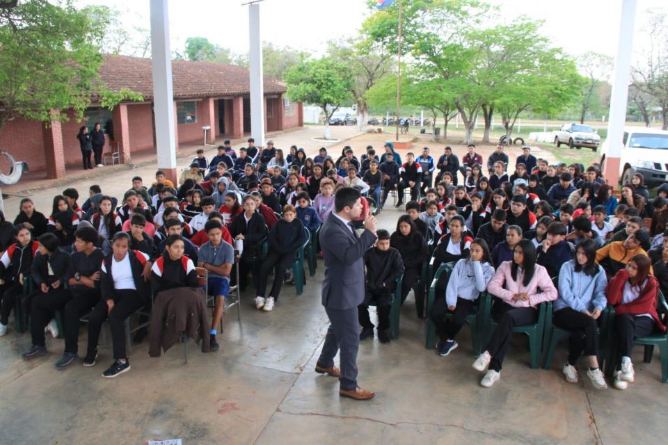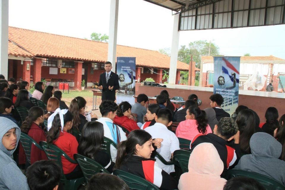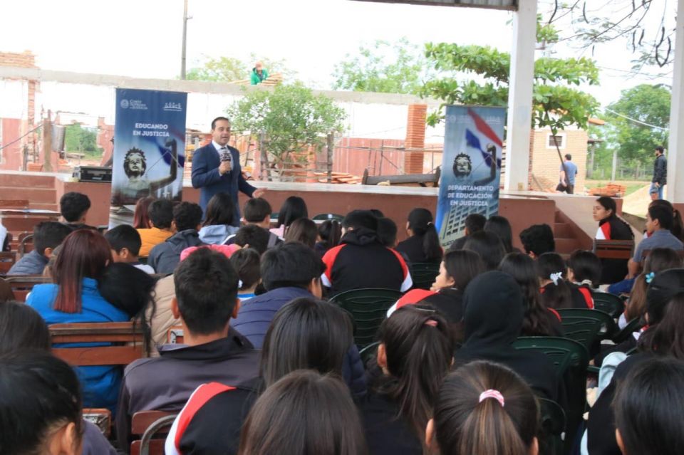 En primer término, en la ciudad de Paso Barreto, en la Escuela Básica N° 445 Isabel Paredes Chávez, la jornada educativa estuvo a cargo del juez penal de la adolescencia, abogado Sergio Ruiz, y del juez de paz, abogado René Valiente, quienes abordaron temas como los derechos y deberes de los niños, niñas y adolescentes, la responsabilidad penal del adolescente, el bullying y el ciberbullying, con activa participación de los estudiantes.