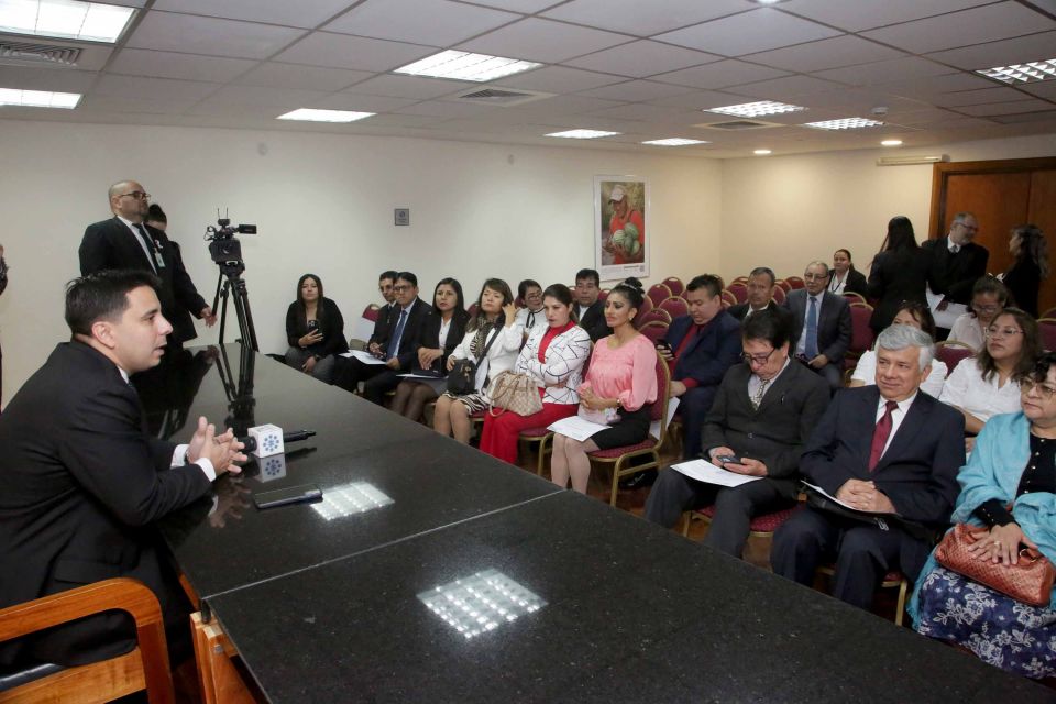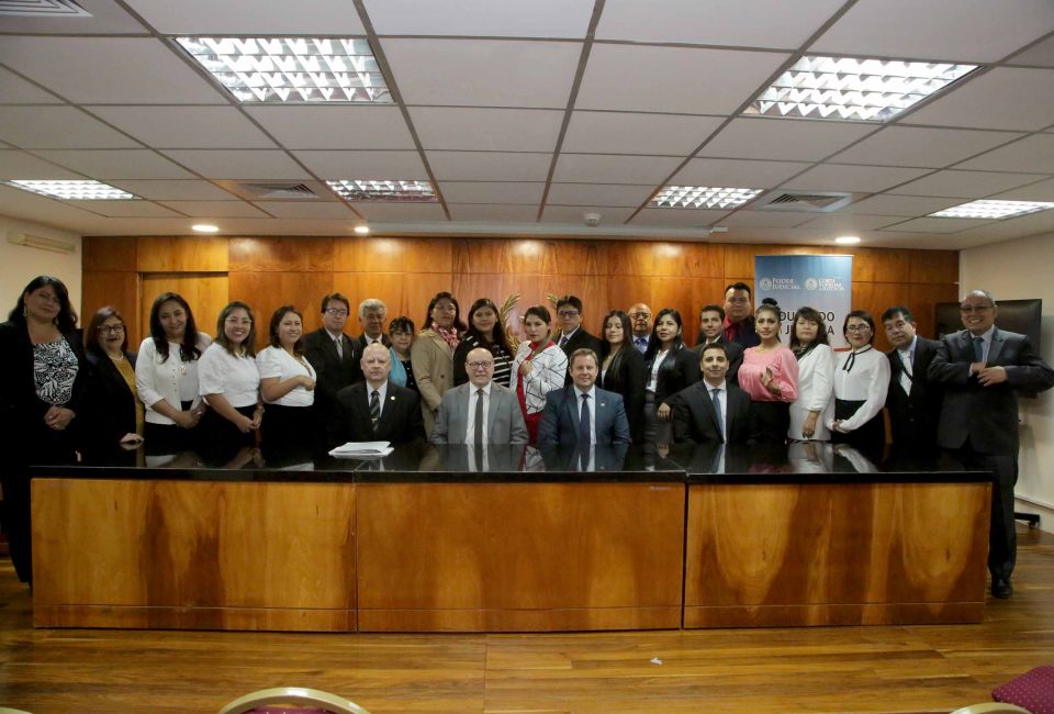 El presidente de la Corte Suprema de Justicia, doctor César Diesel, y los ministros doctores Luis María Benítez Riera y Alberto Martínez Simón recibieron a la delegación peruana participante del programa de Pasantía Judicial Internacional, durante una jornada orientada al fortalecimiento de la cooperación regional y al intercambio de experiencias en el ámbito judicial.