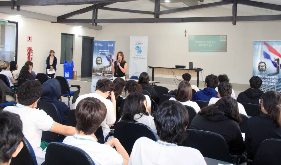 Este martes 14 de octubre el Departamento de Educación en Justicia, dependiente de la Corte Suprema de Justicia, realizó una charla en el marco del programa educativo “El Juez que yo quiero” en el Colegio La Providencia - Universidad Católica “Nuestra Señora de la Asunción”. La disertación estuvo a cargo de la jueza de la Niñez y Adolescencia de la Capital, Bettina Ovando. Participaron alrededor de 100 niños, niñas y adolescentes del 9no grado y 1er y 2do año de la Media.