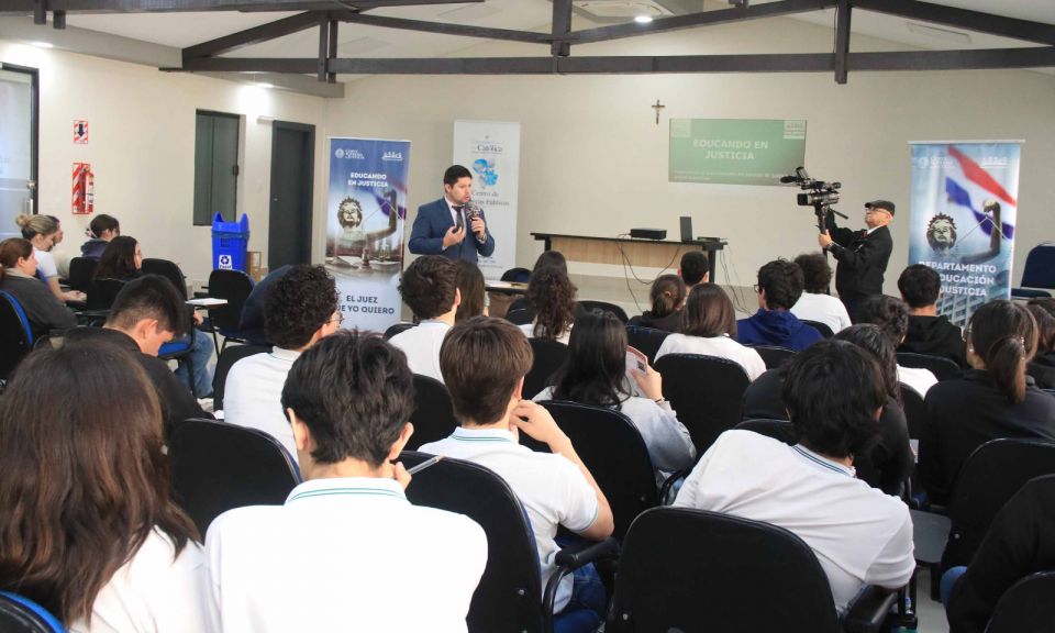 Posteriormente el abogado Aldo Ávalos, abordó temas como los deberes y derechos, la violencia doméstica, el bullying y la responsabilidad penal en adolescentes, y explicó a los alumnos que al cometer hechos punibles un adolescente puede ser imputado desde los 14 años y, en casos graves, la sanción máxima puede llegar hasta 8 años de pena privativa de libertad.