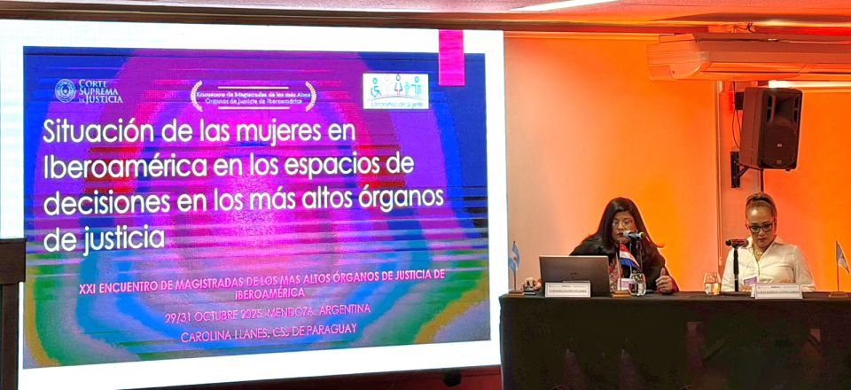 Al referirse al contexto nacional, mencionó que en Paraguay han integrado la Corte Suprema de Justicia cuatro mujeres: la doctora Alicia Pucheta de Correa, primera ministra mujer; la doctora Gladys Bareiro de Módica; la doctora Miryam Peña y la doctora Carolina Llanes, quien actualmente integra la máxima instancia judicial. Agregó que, desde su incorporación en 2019, ha promovido activamente la participación femenina en el máximo tribunal.