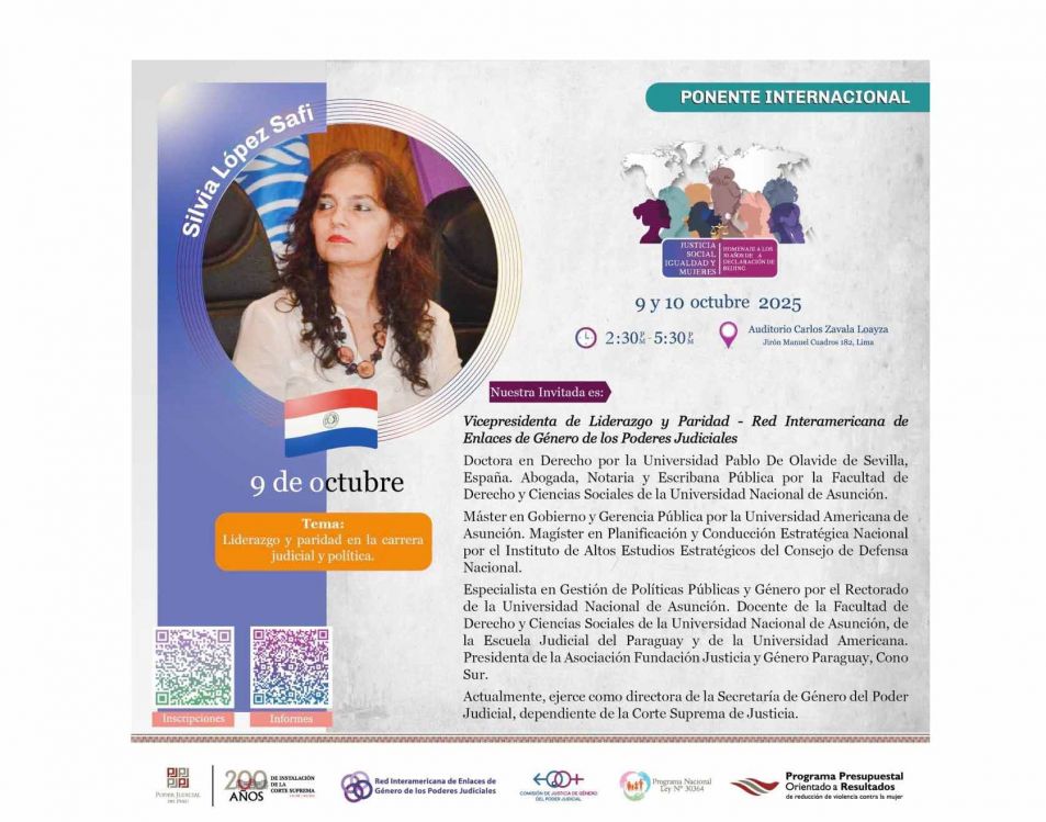 Cabe destacar que, los días 9 y 10 de octubre del presente año, la Dra. López Safi, a invitación de la Dra. Elvia Barrios Alvarado, jueza de la Corte Suprema de Justicia de la República del Perú y presidenta de la citada Red Interamericana, presentó en Lima, Perú, los resultados de su gestión durante el Congreso Internacional “Justicia social, igualdad y mujeres: homenaje a los 30 años de la Declaración de Beijing”.