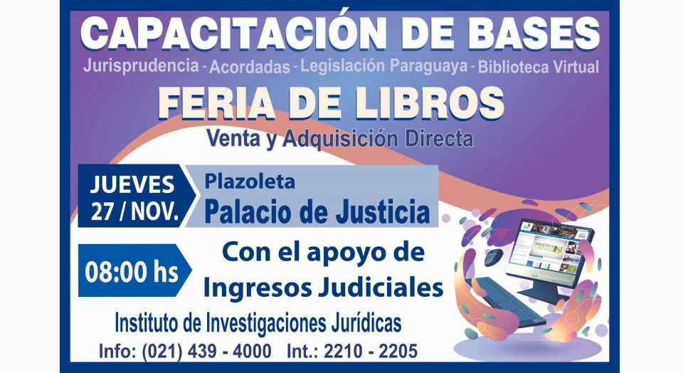 El Instituto de Investigaciones Jurídicas (IIJ), dependiente de la Corte Suprema de Justicia, realizará este jueves 27 de noviembre una feria de libros jurídicos, así como una capacitación sobre el acceso y funcionamiento de las bases de datos en cuanto a temas de jurisprudencia, acordadas, legislación paraguaya y biblioteca virtual. El horario será de 8:00 a 12:00 en la plazoleta del Palacio de Justicia de Asunción.