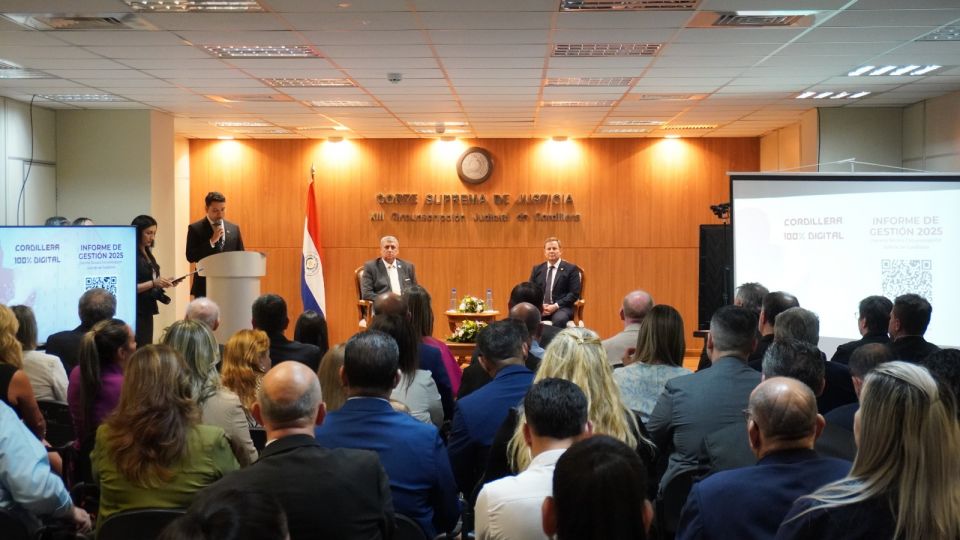 El Consejo de Administración de la XIII Circunscripción Judicial de Cordillera presentó su Informe de Gestión y Rendición de Cuentas correspondiente al año 2025, bajo el lema “Cordillera 100 % Digital”. El acto se realizó en el Salón Auditorio del Palacio de Justicia de Caacupé y fue encabezado por el ministro superintendente de la jurisdicción, doctor Alberto Martínez Simón. Asimismo, contó con la presencia de autoridades locales y nacionales. En la ocasión, se presentó en formato audiovisual y en revista digital un resumen de los logros y avances del año, entre los que se destacan la implementación del expediente judicial electrónico en los 22 Juzgados de Paz.