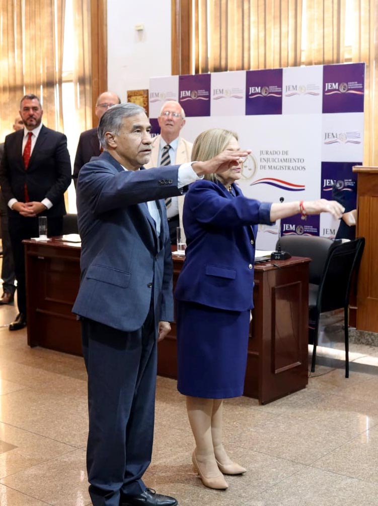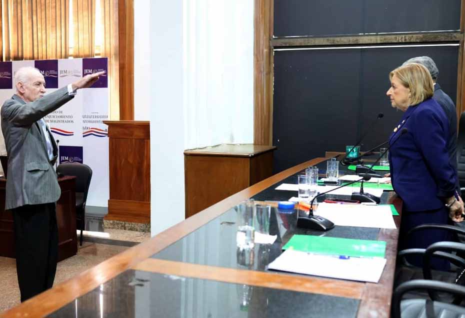 Este jueves 26 de febrero, durante la sesión ordinaria del Jurado de Enjuiciamiento de Magistrados (JEM), los ministros de la Corte Suprema de Justicia, doctores Manuel Dejesús Ramírez Candia y César Garay, quienes ejercen la representación de la máxima instancia judicial ante el JEM, fueron electos por unanimidad y prestaron juramento como vicepresidente primero y vicepresidente segundo, respectivamente, para el período 2026-2027.