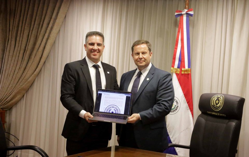 Este viernes 27 de febrero, con la presencia del presidente de la Corte Suprema de Justicia, doctor Alberto Martínez Simón; de los ministros doctores Luis María Benítez Riera, César Diesel y Carolina Llanes Ocampos; y del titular del Ministerio de Tecnologías de la Información y Comunicación (MITIC), Gustavo Villate, se procedió a la firma de renovación del Convenio Marco de Cooperación Interinstitucional entre ambas instituciones. Dicho documento fue rubricado por primera vez en formato digital, reforzando el compromiso institucional con la innovación tecnológica y la mejora de los servicios a la ciudadanía.
