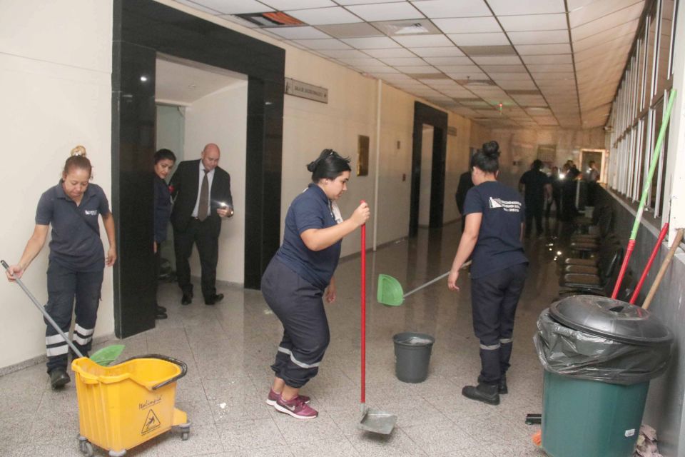 Un incidente registrado en el sistema de desagüe pluvial de la Torre Norte del Palacio de Justicia de Asunción ocasionó filtraciones de agua hacia un sector administrativo del segundo piso. Funcionarios de la Dirección de Infraestructura Física, junto con personal de seguridad y de limpieza, se encuentran trabajando en el lugar para controlar la situación, resguardar el área afectada y verificar las condiciones del espacio.
