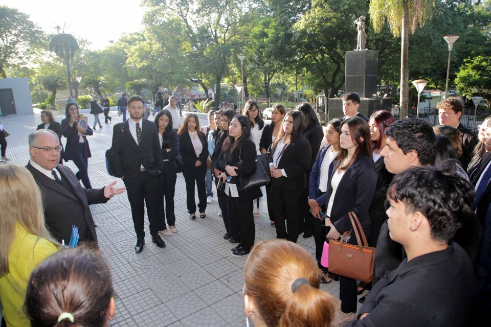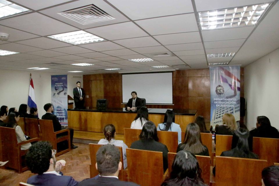 En prosecución de las actividades, los futuros profesionales del Derecho se trasladaron al octavo piso, sala de conferencias de la torre norte, donde participaron de una charla a cargo del juez penal de sentencia del fuero especializado, Matías Garcete, quien ofreció una explicación sobre el procedimiento utilizado en el ámbito penal.