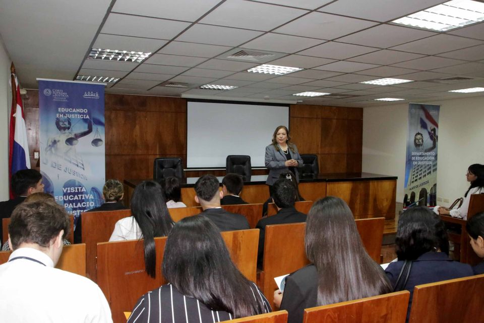 El Departamento de Educación en Justicia, dependiente de la Corte Suprema de Justicia, recibió este viernes 10 de abril la visita de alrededor de 40 estudiantes de la carrera de Derecho de la Universidad de la Integración de las Américas (UNIDA), sede central, en el marco del módulo “Visita Guiada”. El objetivo fue conocer in situ el funcionamiento de la estructura judicial y algunas dependencias del Palacio de Justicia de la Capital.