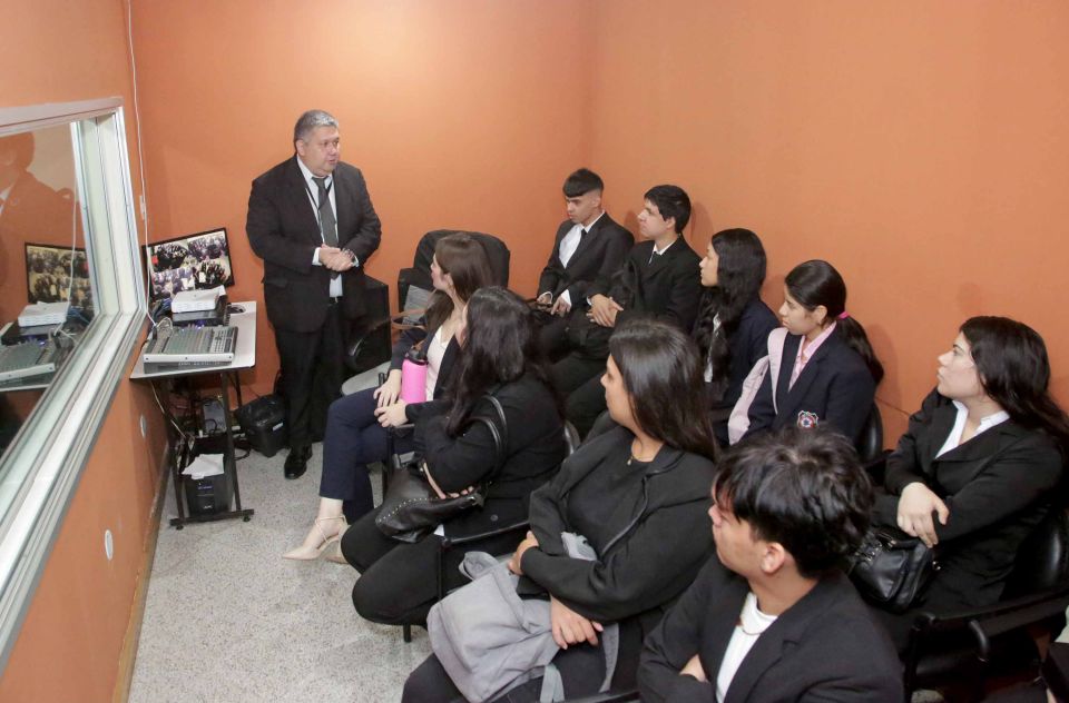 Primeramente, los estudiantes visitaron la Oficina de Apoyo – Cámara Gesell, donde el jefe del Departamento de Psicología Forense, licenciado Juan Vicente Martínez, les explicó la labor que realizan en dicha dependencia, apoyando el proceso tanto en el fuero penal como en niñez y adolescencia. Este procedimiento consta de dos partes: “La primera corresponde al lugar donde se realiza la entrevista de anticipación al niño o adolescente, antes de todo el proceso, mientras que la segunda está conformada por la sala de observación. En el momento de acudir a la Cámara Gesell deben estar presentes todas las partes, y allí también se graba el procedimiento”, explicó el abogado Israel Núñez, encargado de la oficina.