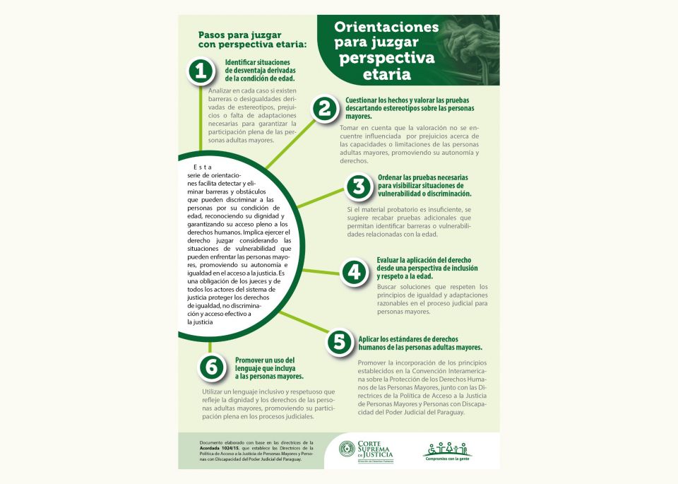 En conmemoración de esta fecha, la DDH presenta el material digital “Orientaciones para juzgar con perspectiva etaria”, elaborado con el propósito de fortalecer la labor judicial y promover decisiones libres de barreras, estereotipos y discriminación. Este recurso se difundirá de manera virtual como parte del compromiso institucional con la igualdad, la inclusión y el acceso efectivo a la justicia para todas las personas, especialmente aquellas que se encuentran en desventaja por su condición de edad, en conformidad a lo establecido en las “100 Reglas de Brasilia”. Además, la CSJ cuenta con el material denominado: “Hechakuaa: Respuestas sensibles y eficientes a la gente”, con el propósito de promover un trato digno, inclusivo y adecuado a todos los usuarios del sistema de justicia, especialmente a aquellos en situación de vulnerabilidad.