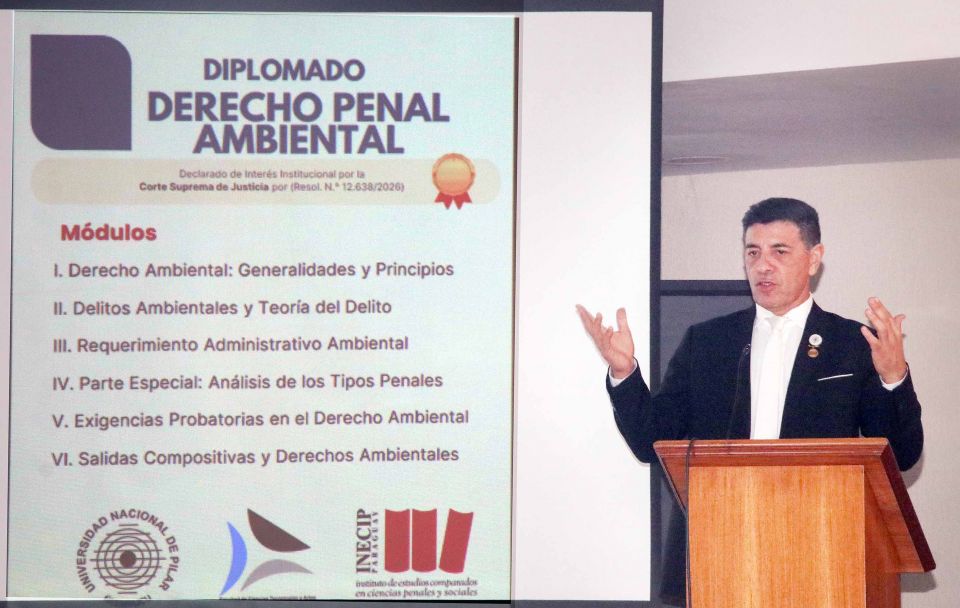 Con la presencia del ministro enlace de la Dirección de Derecho Ambiental y rector de la Universidad Nacional de Pilar, doctor Víctor Ríos Ojeda, se desarrolló la clase inaugural híbrida del Diplomado en Derecho Penal Ambiental (DDA), declarado de interés institucional por la Corte Suprema de Justicia, y organizado por la Facultad de Ciencias, Tecnologías y Artes (FCTA) de la Universidad Nacional de Pilar (UNP), en alianza con el Instituto de Estudios Comparados en Ciencias Penales y Sociales (INECIP). El acto se realizó en el Salón Auditorio “Dra. Serafina Dávalos” del Palacio de Justicia de Asunción.