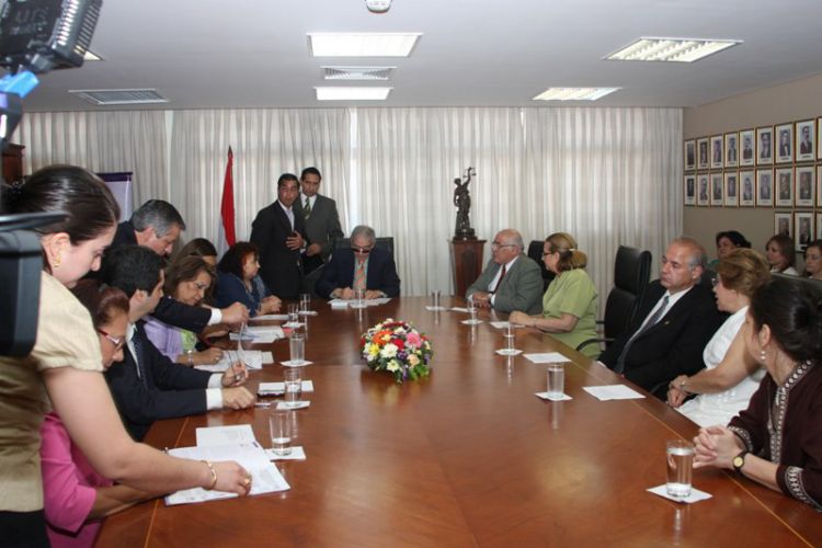 La Corte Suprema de Justicia firmó un convenio con la Secretaría de la Mujer, las Comisiones de Equidad, Género y Desarrollo Social de la Cámara de Senadores y Diputados con el fin de coordinar acciones para la elaboración de un anteproyecto de ley integral para prevenir, sanciones y erradicar la violencia contra las mujeres. El acto se desarrolló en la Sala de Pleno del Palacio de Justicia. Participó el presidente de la máxima instancia judicial, doctor José Raúl Torres Kirmser, al igual que otros ministros del más alto Tribunal del país.