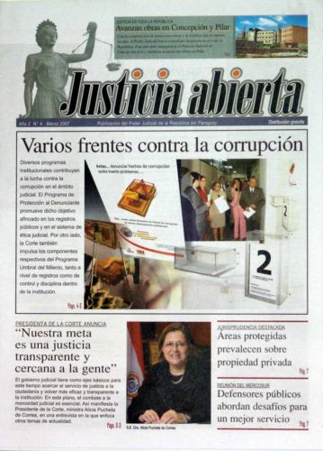 Un nuevo número del periódico “Justicia Abierta” que hace pública las informaciones relacionadas con las actividades de la Corte Suprema de Justicia ya se encuentran en circulación. Está cuarta edición, incluye interesantes temas, como programas que contribuyen a la lucha contra la corrupción del área judicial, los componentes del Programa Umbral del Milenio, y en un artículo central, la presidenta de la Corte Suprema de Justicia, Alicia Pucheta de Correa expone que la meta del máximo organismo judicial es lograr “una justicia transparente y cercana a la gente”.
