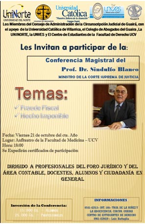 El próximo 21 de octubre, el ministro de la Corte Suprema de Justicia, doctor Sindulfo Blanco dictará una conferencia magistral sobre “Fraude Fiscal y Hecho Imponible”. Se llevará a cabo en el anfiteatro de la facultad de Medicina de la Universidad Católica de Villarrica, a las 18:00 horas.