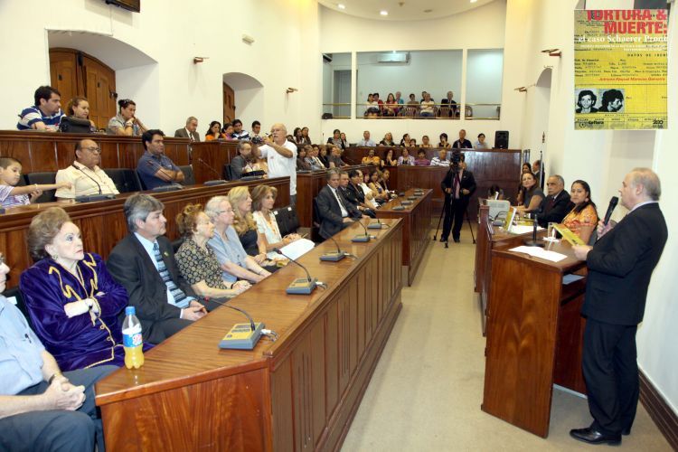 “Tortura y Muerte. Caso Schaerer Prono. Primera respuesta de la justicia a causas El violatorias por terrorismo de Estado” es el nombre del libro presentado ayer en el Centro Cultural de la República, el Cabildo. Durante el acto, la autora del material, la abogada Adriana Marecos Gamarra indicó que la obra destaca el fallo de primera instancia, ya que es la primera vez que se reconoce la responsabilidad del Estado en crímenes de lesa humanidad. Por su parte, el presidente de la Corte Suprema de Justicia, doctor Luis María Benítez Riera expresó que “el éxito del caso se debe a la acción de la querella particular”.