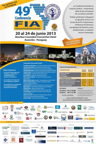 Del 20 al 24 de junio del presente año, la Federación Interamericana de Abogados llevará a cabo la 49ª Conferencia Anual de la FIA, a realizarse por primera vez en nuestro país, específicamente en el Hotel Bourbon de Asunción.