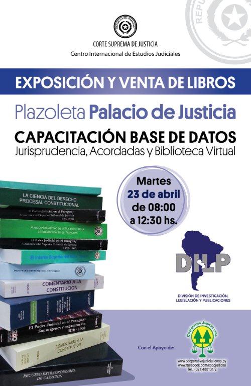Mañana, 23 de abril, se llevará a cabo la feria mensual de libros de la División de Investigaciòn, Legislación y Publicaciones del Centro Internacional de Estudios Judiciales (CIEJ). Durante la jornada estarán a disposición del público jurisprudencias, doctrinas y textos de carácter jurídico en general. La actividad se realizará de 08:00 a 12:30 aproximadamente, en la planta baja del Palacio de Justicia de Asunción.
