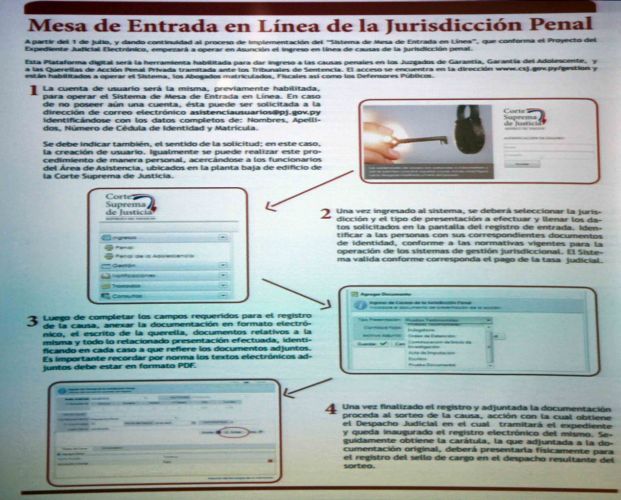 El nuevo sistema de ingreso de causas de la Jurisdicción Penal, para la plataforma “Mesa de Entrada en Línea”, se presentó ante los jueces penales de garantías y sentencia. El encuentro fue dirigido por la licenciada Julia Centurión, directora de Tecnología de la Información y las Comunicaciones, y contó con la presencia del ministro de la Corte Suprema de Justicia doctor Luis María Benítez Riera.